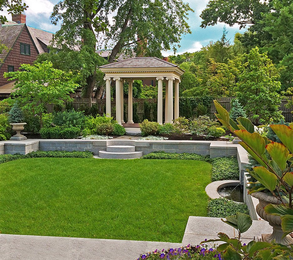 The centerpiece of the garden is a classical summer house inspired by early Federal designs. Its restrained geometry and graceful lines echo the architecture of the home, creating a natural visual dialogue between building and garden. Matching architectural and landscape styles is not mere aesthetic correctness—it is the key to creating a sense of continuity and calm. When materials, forms, and ornament share a common language, the eye moves effortlessly from structure to plantings, perceiving them as parts of a single composition. In this case, the crisp symmetry of the summer house anchors the surrounding garden terraces, reinforcing the harmony of the entire setting.